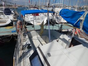 1 Randa, 1 Genoa avvolgibile, Gps cartografico Garmin Gps 421, eco, pilota automatico per timone a barra, Vhf sul tavolo da carteggio, salpa ancora elettrico, 1 frigor elettrico, cucina a 2 fuochi, scaletta in inox, spiaggetta poppiera in acciaio inox e teak, copertura pozzetto (bimini).